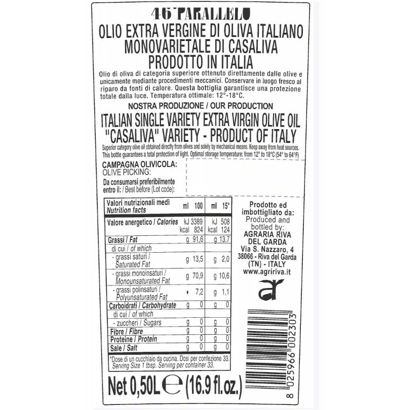 The Extra virgin olive oil monovarietale Casaliva Agraria Riva del Garda is produced only with olives of the variety Casaliva, harvested early to increase the content of polyphenols. Among the polyphenols was isolated a molecule called oleocantale with analgesic that acts as a natural anti-inflammatory like ibuprofen. The use of this oil is then recommended to all, but especially for those who make intensive sports activity.