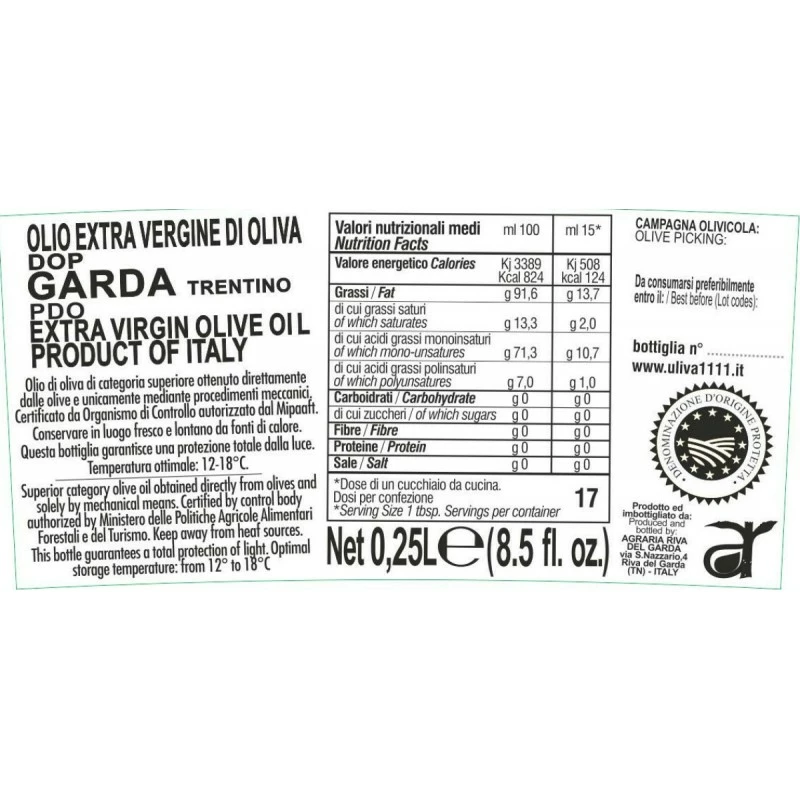 Uliva 1111 produced by Agraria Riva del Garda is a selection of extra virgin olive oil PDO Garda Trentino produced in 1111 numbered bottles. It has quality standards extraordinary respecting a firm registry of manufacturing. It’s a precious object obtained using olives gathered by hand only from olive- trees centuries-old, offered only in numbered bottles, bottled up only to satisfy 1111 experts.