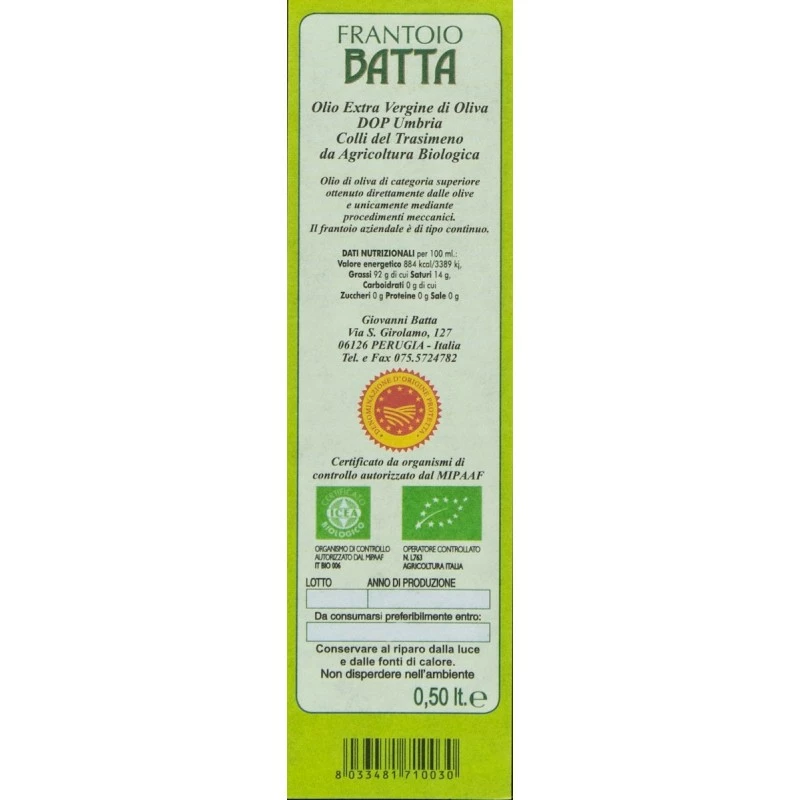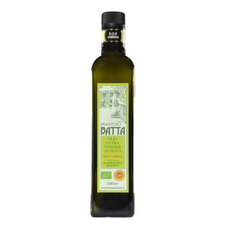 The Extra Virgin Olive Oil Organic DOP Umbria Colli del Trasimeno Frantoio Batta is an intense golden yellow extra virgin olive oil with greenish nuances, limpid. The nose is very fragrant, with a sensation of particular freshness; in the mouth it offers flavors of field essences, artichoke and green almond with sustained bitterness and spiciness, in harmony.