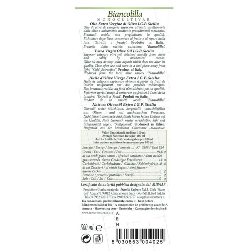 The Extra Virgin Olive Oil Gran Cru Biancolilla Cutrera is a monocultivar olive oil from Biancolilla, slightly bitter with pronounced spiciness.