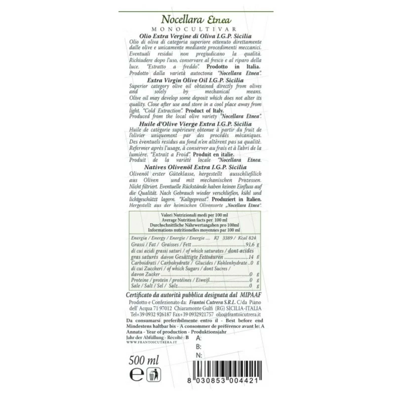 The Extra Virgin Olive Oil Gran Cru Nocellara Etnia Cutrera is a monocultivar oil from ‘Nocellara dell’Etna’ typical from the slope of the vulcano, intense but extremely armonic and elegant, in the kitchen it’s very versatile thanks to its harmony.