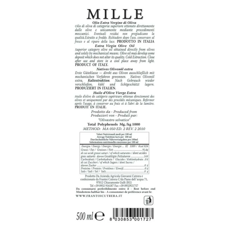 The Extra virgin olive oil Cutrera Mille is an extra virgin olive oil with high content of polyphenols. Is produced on the mountains Iblei by olive trees, shrubs on the banks of streams and creeks.