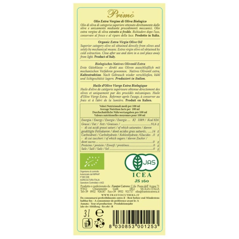 Extra Virgin Olive Oil Primo Bio can Cutrera 3l is a monocultivar oil from ‘Tonda Iblea’ that has obtained several awards, such as the most illustrious of last year, special price ‘Best Organic’ from Zurigo.
