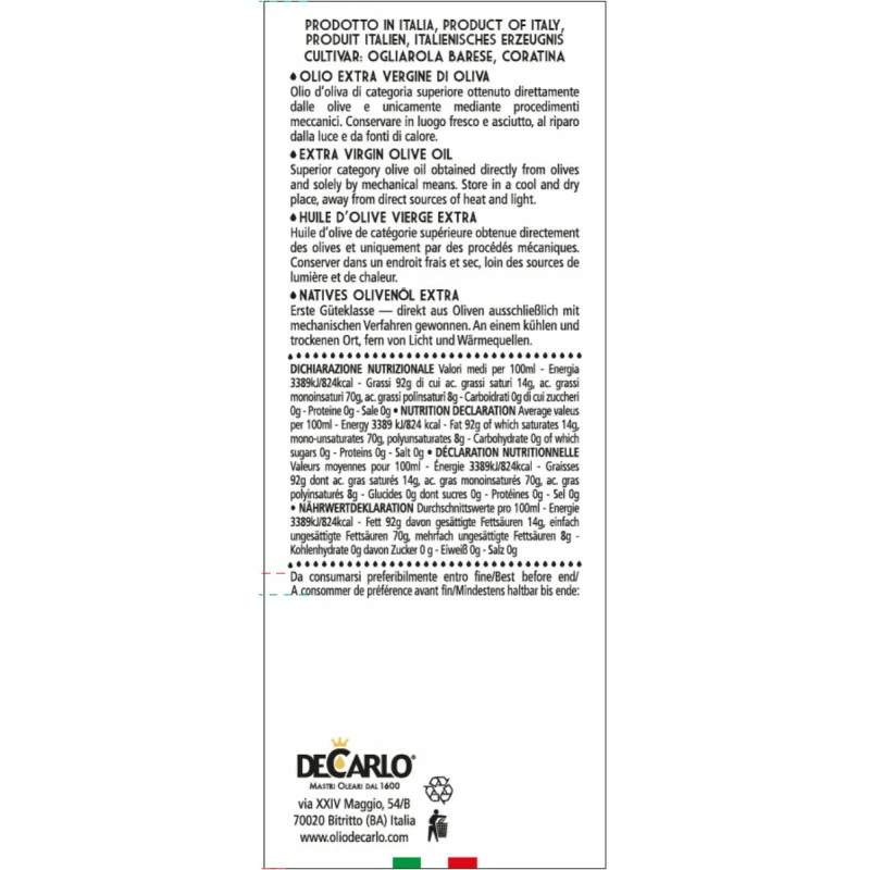 The Extra virgin olive oil il Classico De Carlo is a delicate and balanced olive oil, an historic and award-winning oil. Olives from Ogliarola and Coratina farms go directly into the company’s crusher within 24 hours. Ideal for seasoning any food without the risk of altering of the beneficial qualities of the raw materials involved in its production.