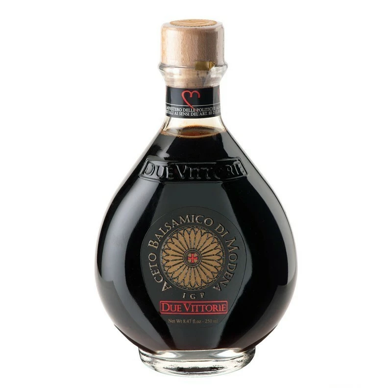 The Balsamic Vinegar of Modena PGI Gold 250ml produced by Agricola Due Vittorie is dense, full-bodied, obtained according to procedures handed down over the centuries and left to rest in oak vats. Used by the best chefs all over the world, it’s the No. 1 in Italy best selling product in the 250-ml segment among the brand producers, according to Nielsen data since September 2010. Due Vittorie Oro spends a good part of its life in oak vats, which favor the transfer of tannins and the assumption of wood essences. Before bottling, Balsamic Vinegar is rigorously tested in the laboratory, which ensures compliance with current regulations and high quality. The sugary structure of the Due Vittorie Oro is harmoniously associated with the degree of acidity, while the density and the perfume contribute to the completion of the sensorial approach, which is extremely satisfying. The aftertaste of black cherry culminates the tasting, reminding us of the thousand happy combinations of the dressing, to be served on any occasion