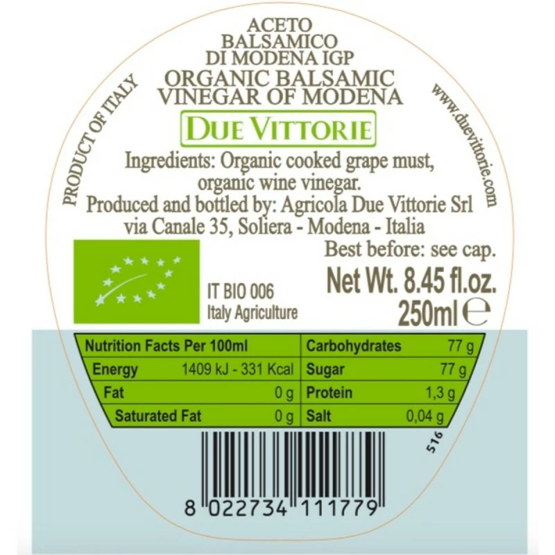 The Balsamic Vinegar of Modena PGI Gold organic by Agricola Due Vittorie is obtained exclusively from vines grown organically without using pesticides and with full respect for the environment. The whole process is certified in order to ensure compliance with the highest standards guaranteed by the Certification Body.
