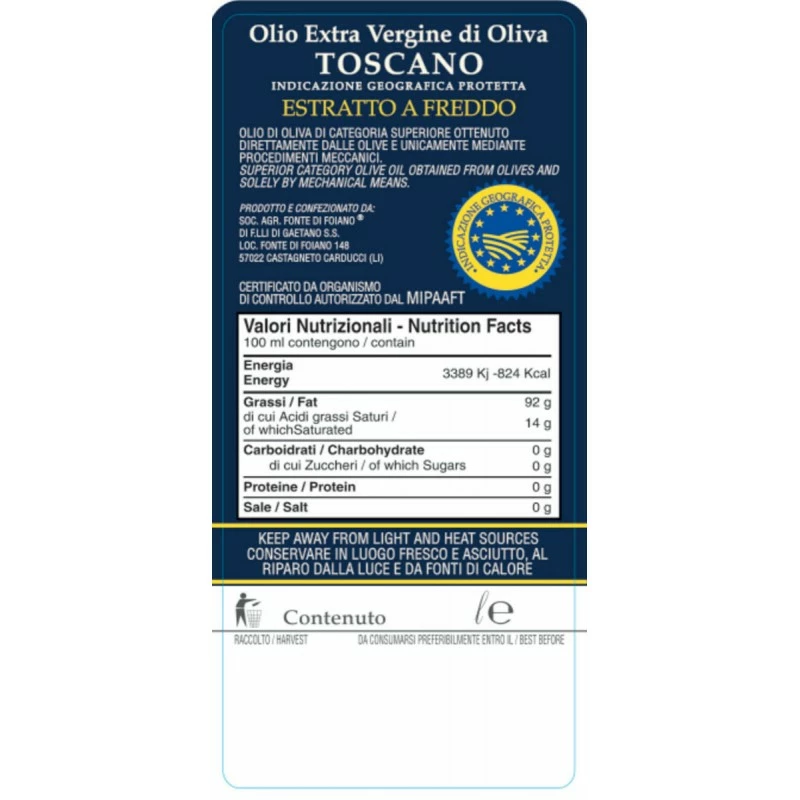 The Extra virgin olive oil Toscano IGP by Fonte di Foiano is produced with Olives of Frantoio, Moraiolo and Leccino in October and November. It is a character oil suitable for people looking for a fresh and balanced product.