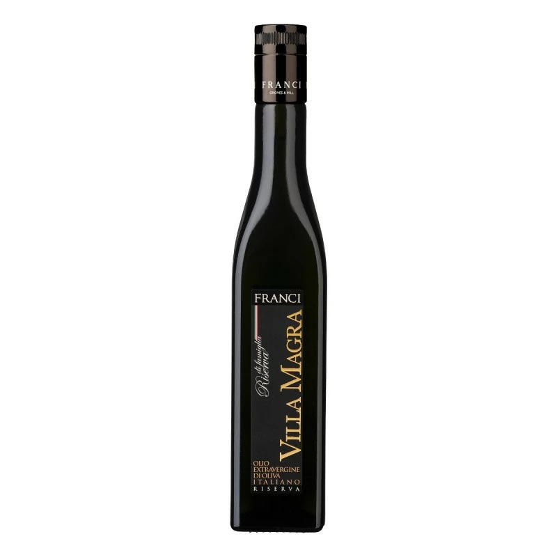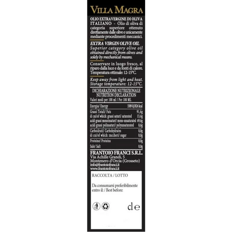 Extra Virgin Olive Oil Villamagra ‘Franci’ is the emblem of the company Franci. The first oil that has been packed it has been produced with this tag. It takes its name from centuries old olive grove destroyed by the frost in 1985 and planted in 1987 situated over hills Montenero d’Orcia displayed at north, north-east.
