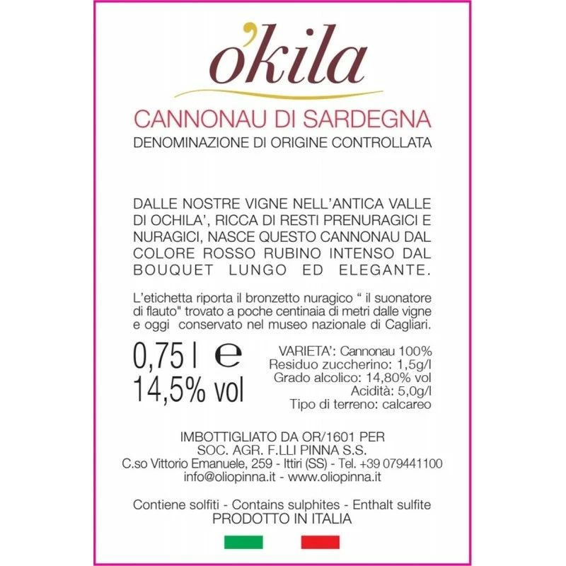 The Red Wine Okila Cannonau di Sardegna DOC by Fratelli Pinna is a wine with an intense ruby red color with garnet reflections. It is produced in the vineyards of the Ochila valley.