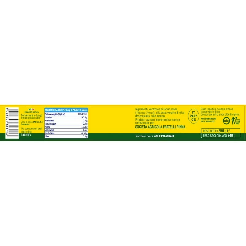 The Ventresca of Red Tuna in extra virgin olive oil produced by Fratelli Pinna is obtained from bluefin tuna (thunnus thynnus) fished with hooks and longlines in Carloforte, entirely handmade and stored in bosana monocultivar pitted extra virgin olive oil.