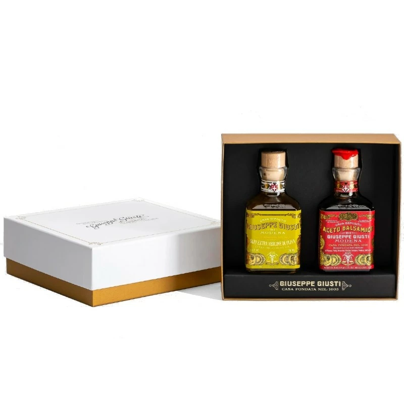 The Duetto Extra Virgin Olive Oil and Balsamic 3 Gold Medals Giusti is an elegant box containing the new Extra Virgin Olive Oil and Balsamic Vinegar of Modena PGI 3 Gold Medals.