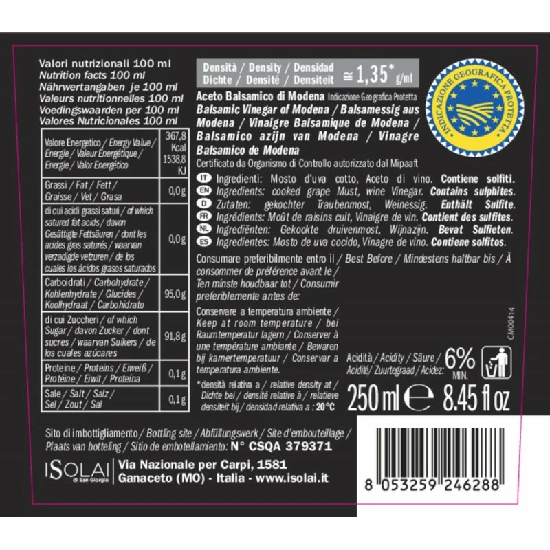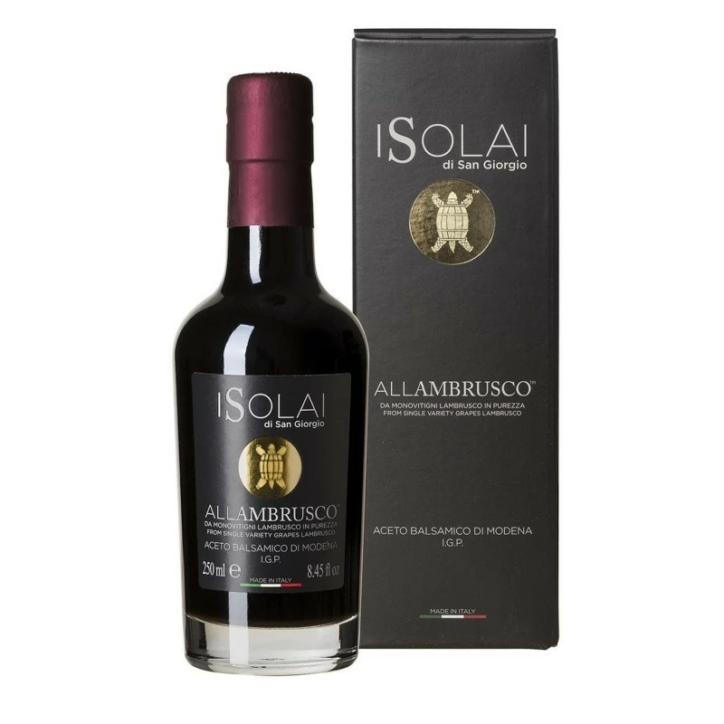 The Balsamic Vinegar of Modena PGI Allambrusco by I Solai is a balsamic vinegar made only with Lambrusco grapes from Emilia Romagna. The perfume, body and softness of Lambrusco musts (Sorbara, Grasparossa and Salamino) make it a unique product in the world. This singular high density balsamic vinegar is exquisite, rich, full-bodied and with notes of berries. The taste is spicy and sweet, persistent but delicate.