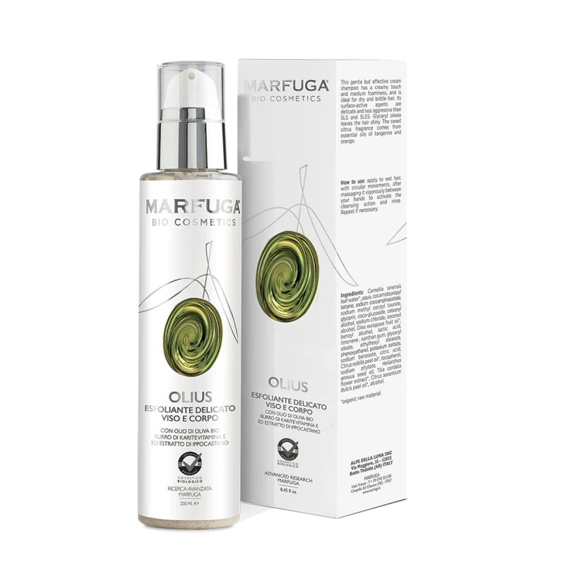 The Delicate exfoliating face and body Olius by Marfuga is produced with organic olive oil, vitamin E shea butter and horse chestnut extract. It is a gentle exfoliator for face and body to remove impurities without drying out the skin. With vegetable granules.