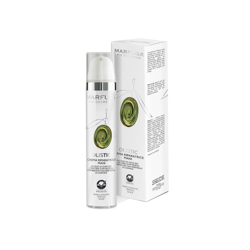The Repairing Cream Hands Olistic by Marfuga is produced with organic olive oil with propolis vitamin E beeswax and lavender essential oil. It is a cream with a rich texture; it is indicated for dry skin and/or for those with hands that are very sensitive to external factors such as aggressive detergents, cold and winter wind and/or in any case for those who often use them for manual work and have small problems such as chapping and dry hands.