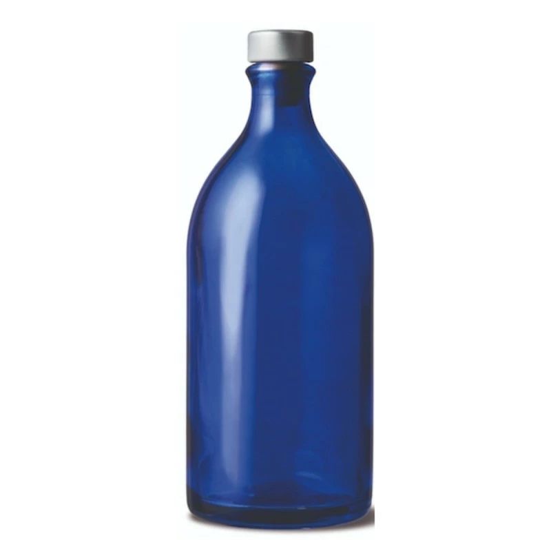 Monocultivar obtained from the variety of Peranzana olives in a jar made of refined and light blue glass.
