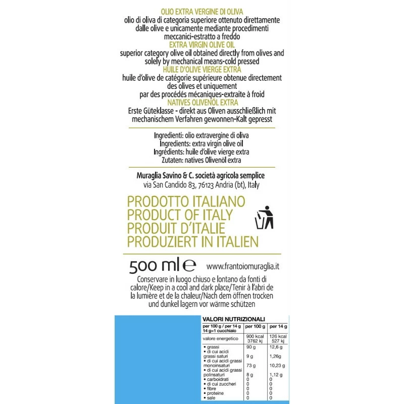 The Extra Virgin Olive Oil Essenza Intense Fruity Muraglia is a single cultivar obtained from olive varieties Coratina, and exclusively by the trees of the company. The squeezing occurs within 24 hours of collection. The product is bottled in Essenza bottle.
