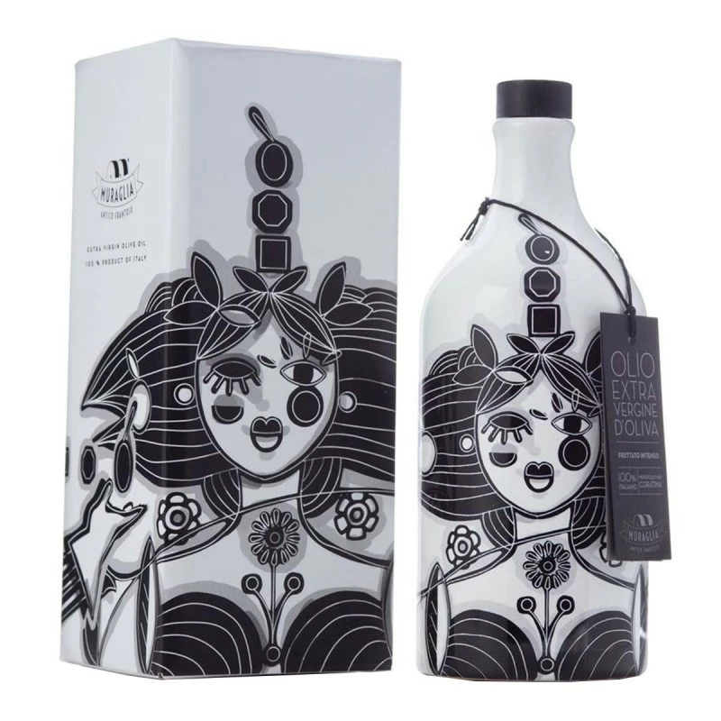 The Extra virgin olive oil Mother Nature ceramic jar Peranzana Muraglia is a 100% Apulian extra virgin olive oil, from the contents to the container. This is how the bottles containing the precious Extra Virgin Olive Oil Frantoio Muraglia and handmade by Apulian potters for the first time abandon the iridescence of colors to let themselves be enveloped by white strokes and imprint a new design in a first Limited Edition of Orci unique and iconographic based on the geometric dichotomies of the Salento artist Pierpaolo Gaballo.