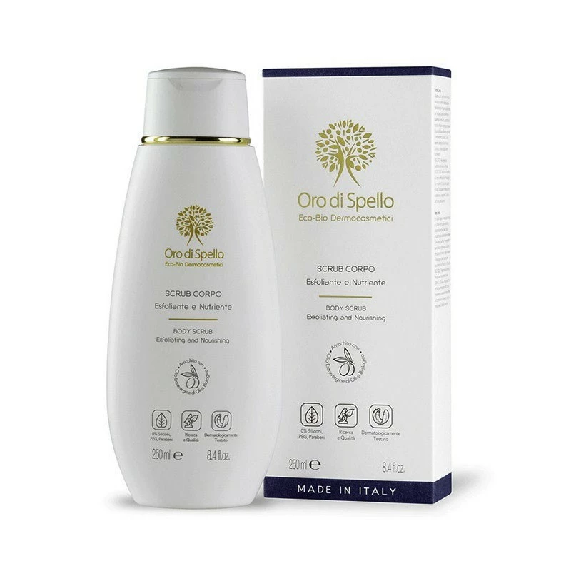 The Body Scrub of Oro di Spello has an exfoliating and nourishing action on the skin. It is suitable for all skin types. The scrub formula has a double exfoliating action, able to remove dead cells by smoothing the skin and eliminating at the same time impurities on the surface. The particles of the olive kernel, combined with granules of pure cellulose and allantoin, stimulate cell renewal of the skin. Organic sesame oil and organic shea butter instead give the skin moisture and nourishment.