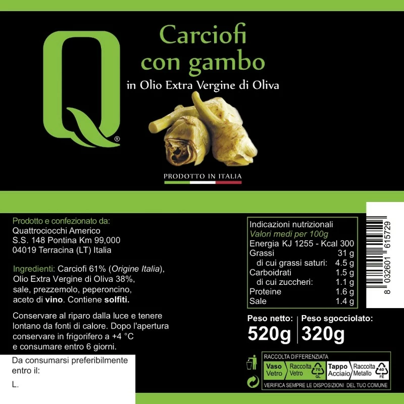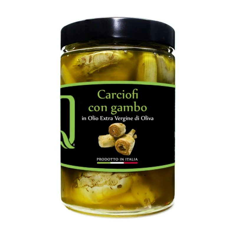 The Artichokes with stem in Extra Virgin Olive Oil Quattrociocchi are produced with artichokes with stem and Extra Virgin Olive Oil.