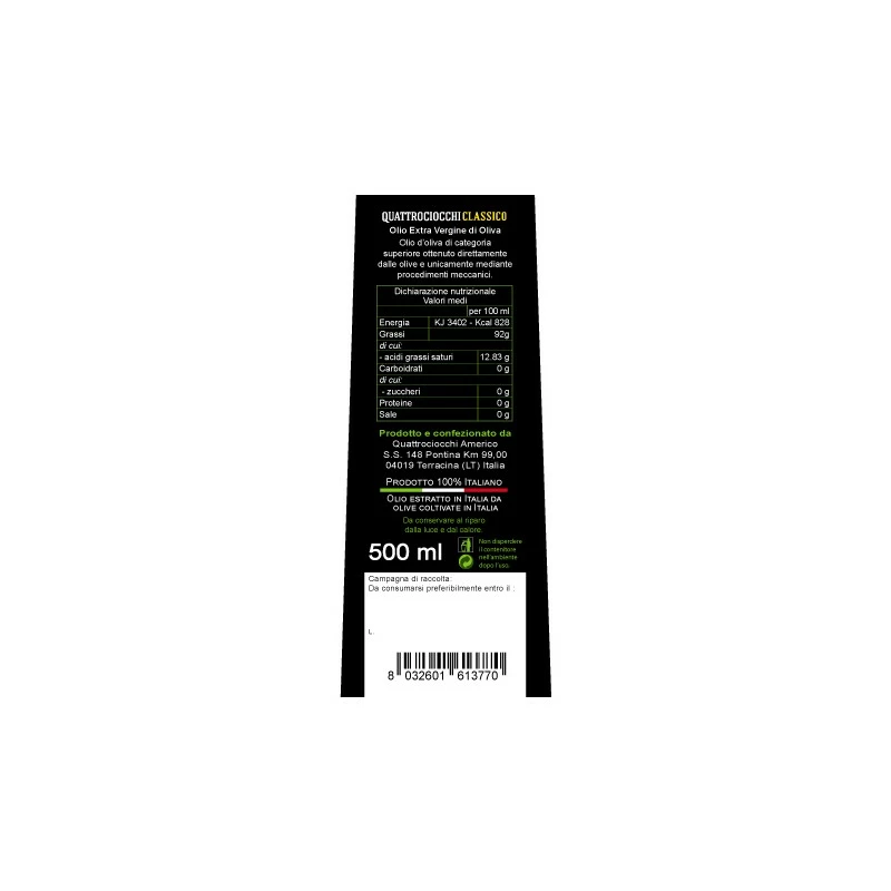The Extra Virgin Olive Oil Classico Quattrociocchi is produced from carefully selected olives Itrana, Moraiolo and Leccino, cultivated in the farm of Quattrociocchi in Alatri. The olive groves are located on Ernici, they are all exposed to the sun and caressed by the breeze foothills. The hand-picked olives are milled daily in the Quattrociocchi’s mill.