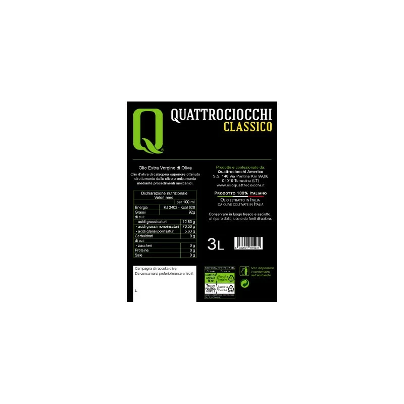 The Extra Virgin Olive Oil Classico can 3lt Quattrociocchi is produced from carefully selected olives Itrana, Moraiolo and Leccino, cultivated in the organic farm of Quattrociocchi in Alatri. The olive groves are located on Ernici, they are all exposed to the sun and caressed by the breeze foothills. The hand-picked olives are milled daily in the Quattrociocchi’s mill.