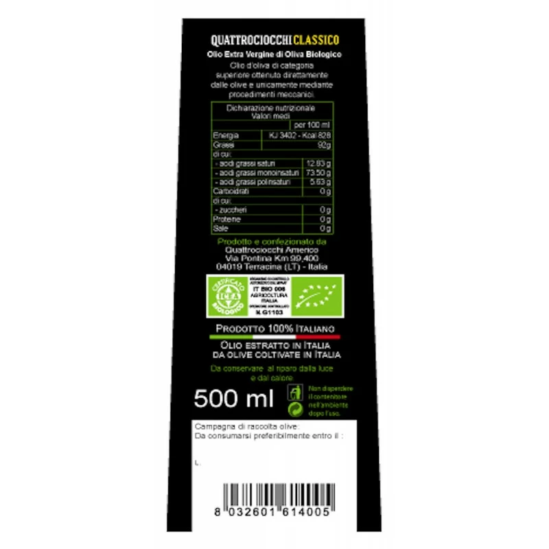 The Extra Virgin Olive Oil Classico Organic Quattrociocchi is produced from carefully selected organic olives Itrana, Moraiolo and Leccino, cultivated in the organic farm of Quattrociocchi in Alatri. The olive groves are located on Ernici, they are all exposed to the sun and caressed by the breeze foothills. The hand-picked olives are milled daily in the Quattrociocchi’s mill.