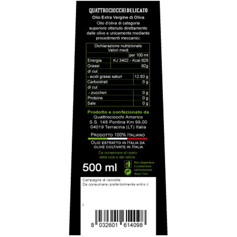 The Extra Virgin Olive Oil Delicato Leccino Quattrociocchi it’s an extra virgin of excellent choice, 100% Italian, manufactured from olives exclusively from its own farm company of the ‘Leccino’ variety.