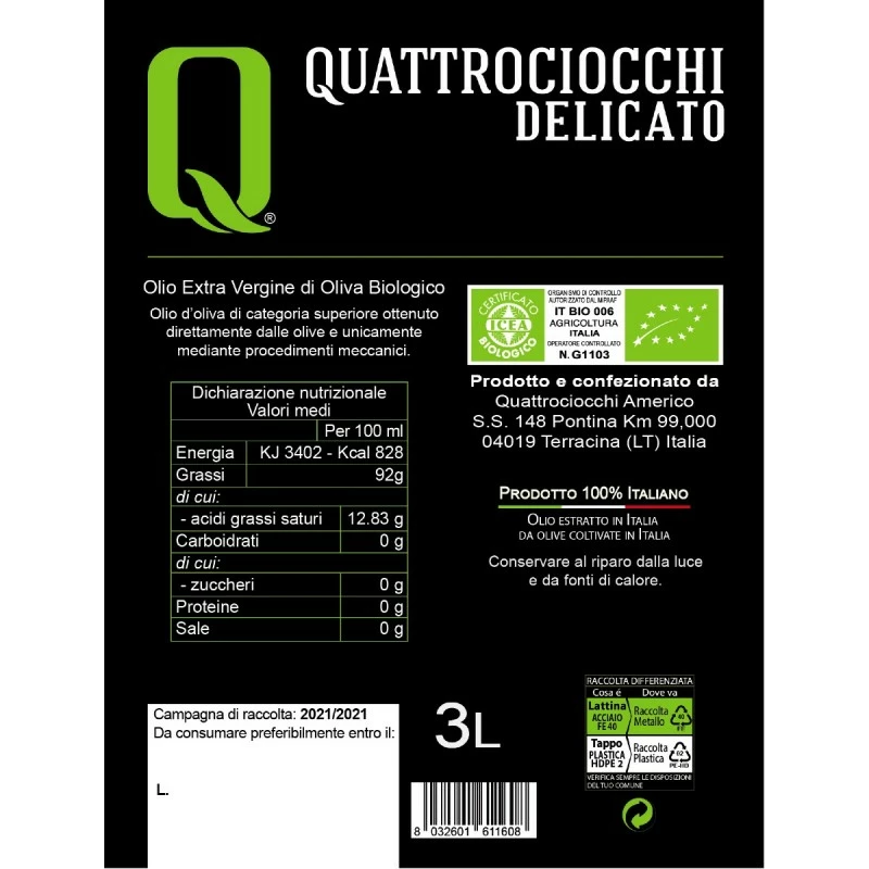 The Extra Virgin Olive Oil Delicato Leccino Organic can Quattrociocch is an extra virgin of excellent choice, 100% Italian, manufactured from olives exclusively from its own farm company of the ‘Leccino’ variety.