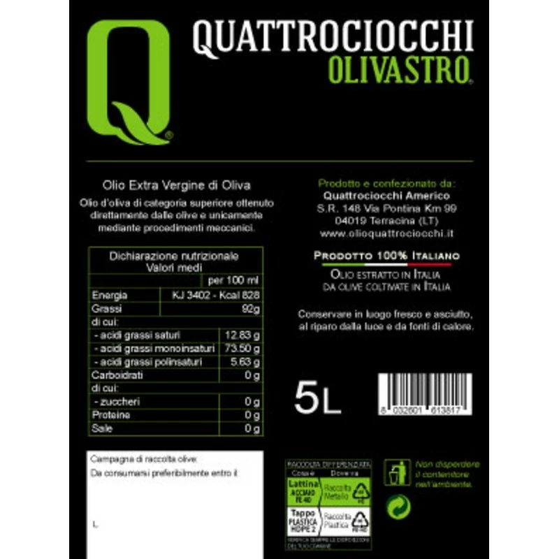 The Extra Virgin Olive Oil Olivastro can Quattrociocchi is an extra virgin of excellent choice, 100% italian, manufactured from olives exclusively from its own farm company from Alatri of the ‘Itrana’ variety.
