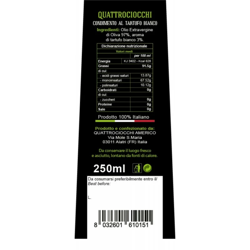 The Extra Virgin Olive Oil Truffle aromatized Quattrociocchi is a condiment made of Extra Virgin Olive Oil and Truffle obtained with the simultaneous pressing of the olives with truffle.