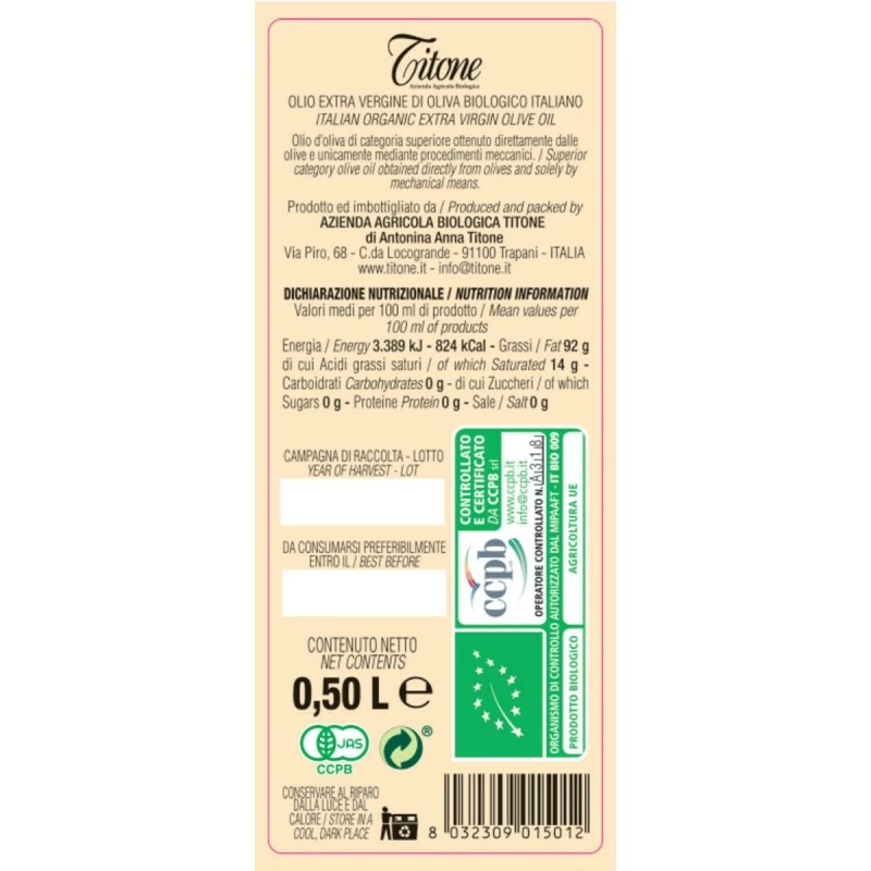 The Extra Virgin Olive Oil Nocellara Titone is produced from Nocellara del Belice monovarietal olives. The olives, still very green, are harvested by hand and, after stopping in a thermo-conditioned environment, are pressed into the farm after three hours from the harvesting with toothed disc crushers and closed-temperature controlled grinders. The oil thus obtained is stored under nitrogen and filtered after a few days.