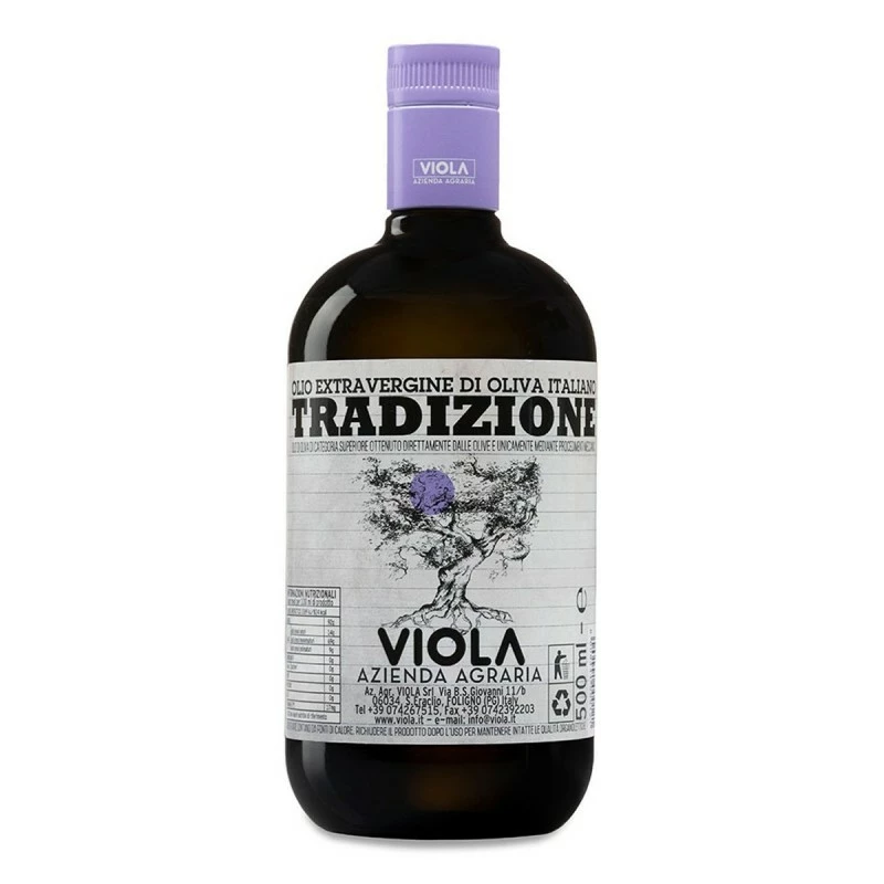 The Extra Virgin Olive Oil Tradizione by Viola is produced from the varieties of moraiolo, frantoio, leccino and other minor varieties of olives. Plants grown on stony and very permeable calcareous soils, placed at an ideal altitude for cultivation; parsimonious in the form and production of the fruit; cure and touch only by the hands of man.